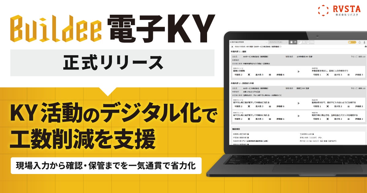 株式会社リバスタ(本社:東京都江東区、代表取締役:高橋巧、以下 当社)は、建設現場施工管理サービス「Buildee(ビルディー)」において、KY(危険予知)活動(※1)の記録・確認・保管をデジタル化するオプションサービス「Buildee 電子KY(以下 本サービス)」(※2)を、2026年4月1日より正式リリースしました。