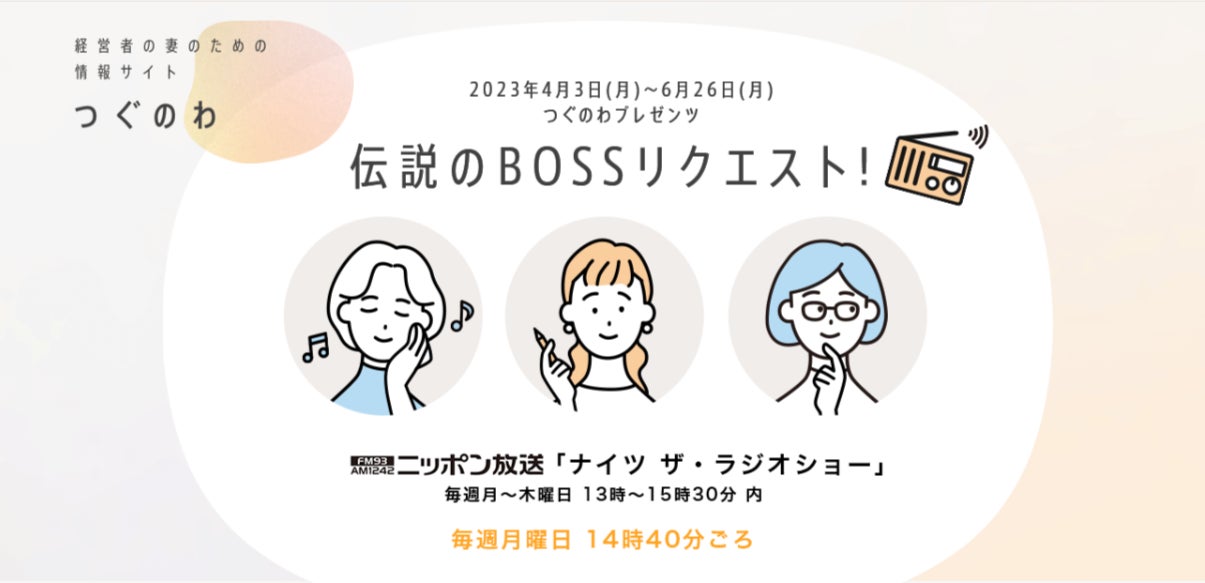 生命保険を通じて日本の中小企業を応援するエヌエヌ生命保険株式会社(代表取締役社長:マリウス・ポペスク、本社:東京都渋谷区、以下「エヌエヌ生命」)が運営する「経営者の妻のための情報サイト つぐのわ」(以下「つぐのわ」)は、ニッポン放送のレギュラーラジオ番組「ナイツ ザ・ラジオショー」で特別コーナー「つぐのわプレゼンツ 伝説のBOSSリクエスト!」を提供し、本日4月3日(月)より放送を開始します。