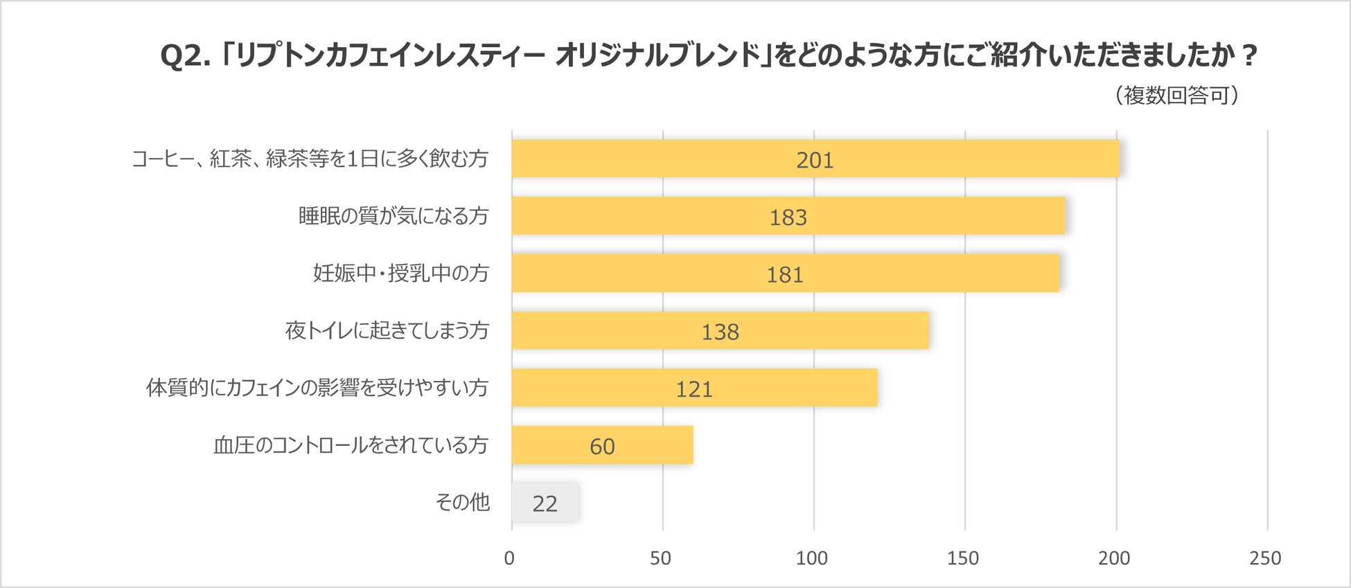 「『リプトン カフェインレスティー オリジナルブレンド』をどのような方にご紹介いただきましたか?」との質問には普段から「コーヒー、紅茶、緑茶等を1日に多く飲む方」へ最もおすすめしたいと、カフェインを必要としている人だけでなく、日ごろから紅茶やお茶の飲用機会のある方へもご紹介いただきました。