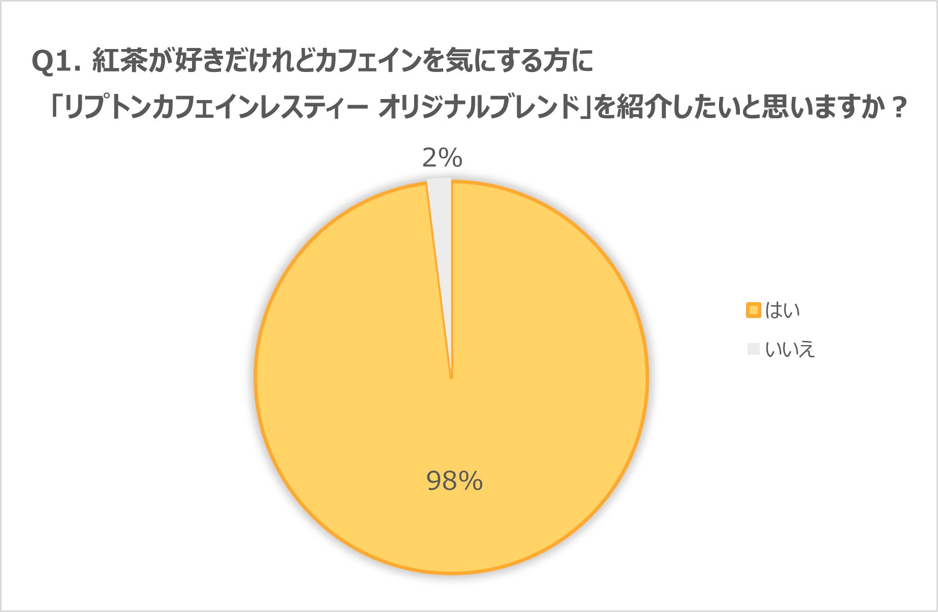 この度、全国の医療機関に勤務する管理栄養士339名に実際に本製品を試飲いただいた上で、「紅茶が好きだけれどカフェインを気にする方に『リプトン カフェインレスティー オリジナルブレンド』を紹介したいと思いますか?」というアンケート調査※1を実施したところ、98%の方々からこの製品を推奨したいと回答いただきました。カフェインレスとは思えない味わいと香りなど、従来のカフェインレス紅茶のイメージからのポジティブなギャップへの評価や、妊娠中の方やカフェインを気にする方、高齢者の方など幅広い年齢層の方々におすすめしたいとの声が寄せられました。