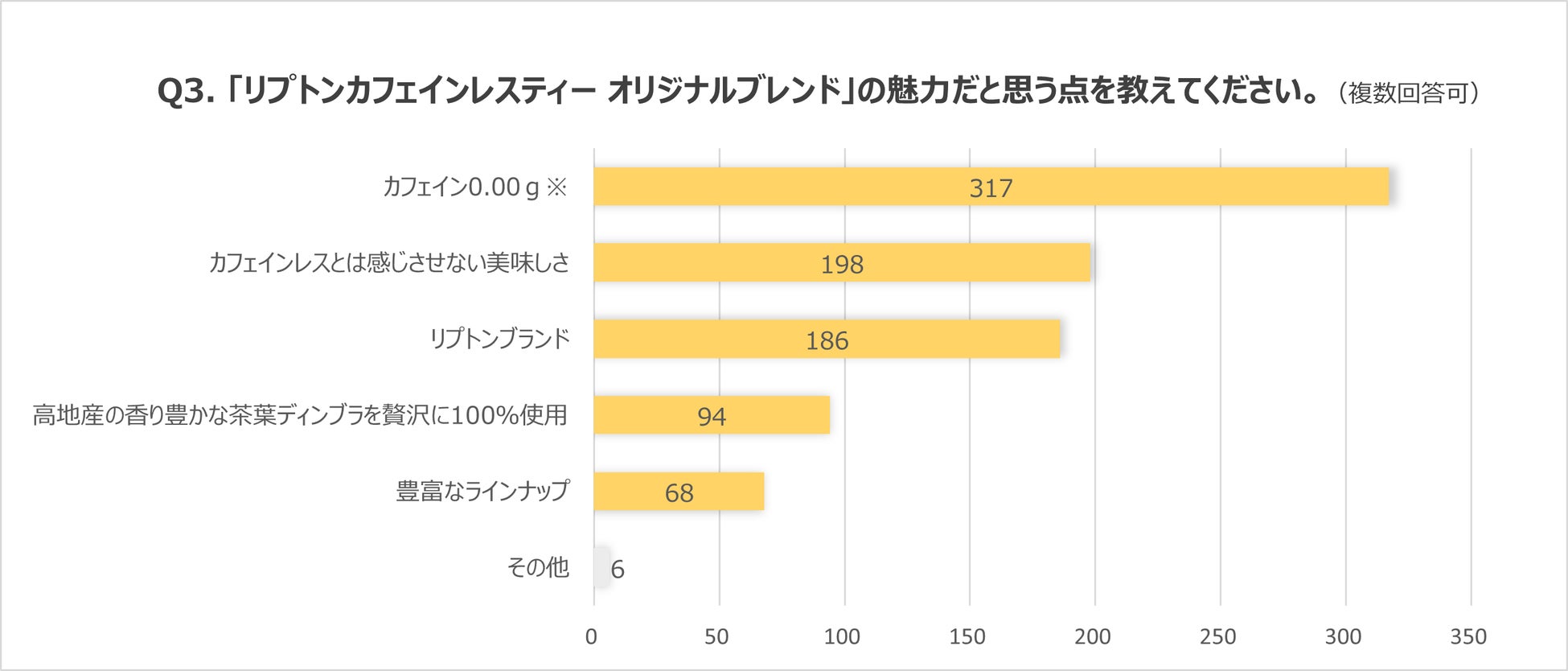 さらに、「『リプトン カフェインレスティー オリジナルブレンド』の魅力だと思う点を教えてください」との質問には、商品特徴でもある「カフェイン0.00g※2」であること、次いで半数以上の管理栄養士の方が「カフェインレスとは感じさせないおいしさ」と回答。2018年の発売以来、「カフェインレスだけど、紅茶本来の味わいと香りを楽しみたい」という幅広い人々に支持されてきた、本製品の魅力を裏付ける結果となりました。