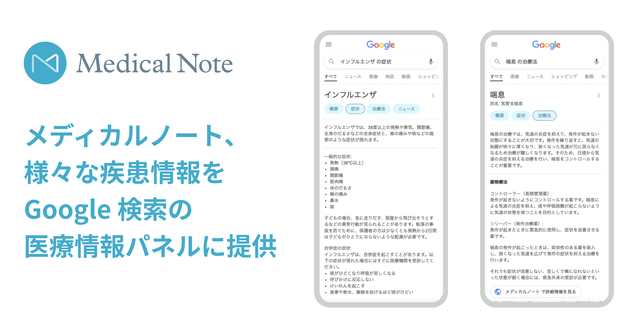 株式会社メディカルノート(東京都港区、代表取締役CEO:梅田 裕真、代表取締役:井上 祥、以下、メディカルノート)は、医療・ヘルスケアプラットフォーム「Medical Note」に掲載する疾患情報を、Google 検索の医療情報パネルへ提供開始しました。