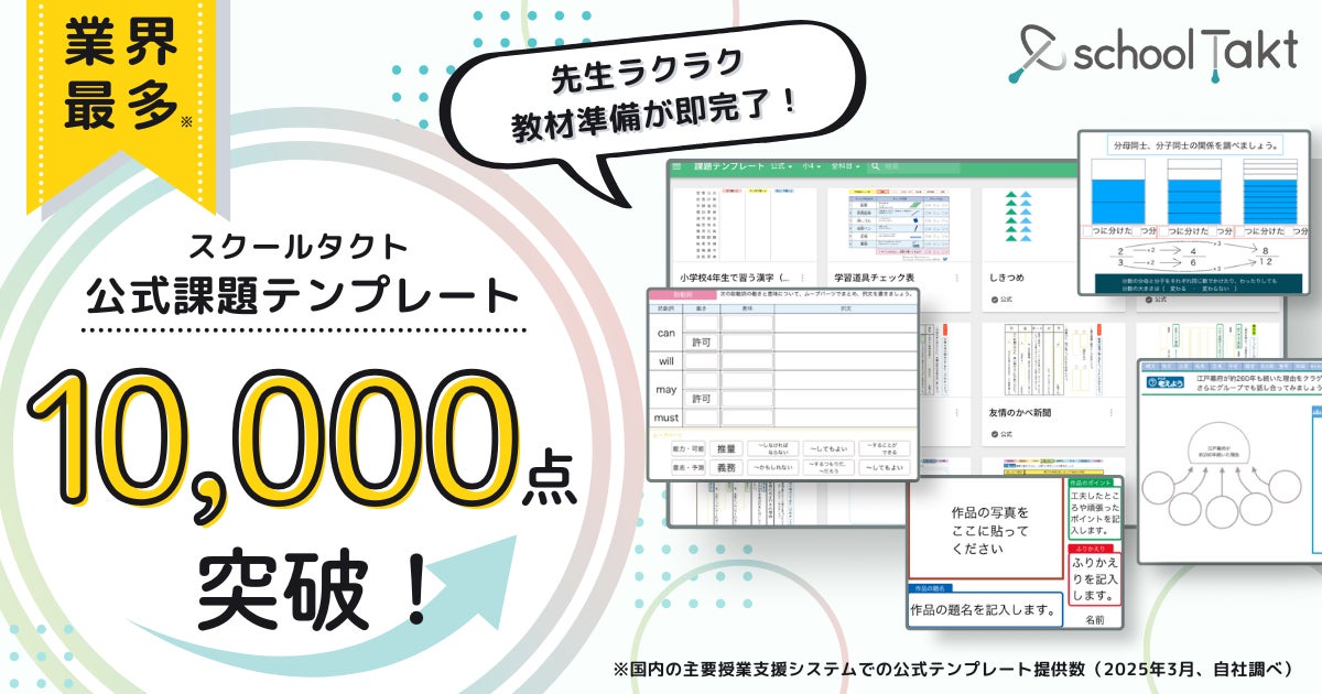 株式会社コードタクト(本社:東京都渋谷区、代表取締役:後藤 正樹、以下「当社」)の授業支援クラウド「スクールタクト」が提供する公式課題テンプレートが、業界最多※となる1万点を超えました。授業のワークシートとしてすぐに活用できるテンプレートが充実することで、先生の教材準備の負荷を軽減し、児童生徒一人ひとりに向き合う時間を生み出します。