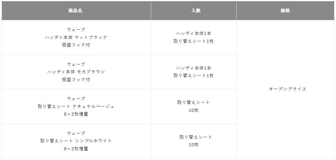 そこでこのたび、空間と調和するマットブラックとモカブラウンの限定カラーを採用した『ウェーブハンディワイパー』の本体に、壁面などへ吊り下げて収納できる「吸盤フック」を付属した企画品を発売します。同時に、「取り替えシート」は、2枚増量の企画品として発売します。