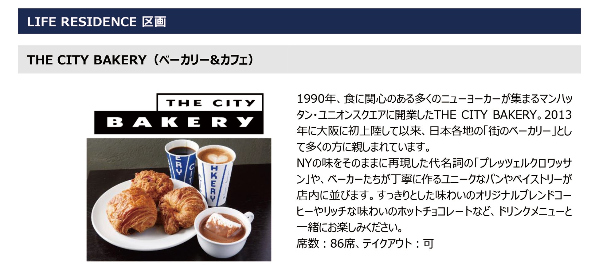 今回、出店が決定したテナントは、輸入車ディーラーのショールーム、ベーカリー&カフェ、レストラン、エステサロン、コワーキングスペースの6テナントです。第1期オープンに先駆けて2023年9月26日(火)にLIFE RESIDENCE区画の3テナントがオープンし、残るテナントは第2期オープンに向けて10月以降に順次オープンする予定です。