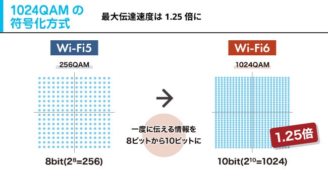 - 1024QAMの符号化方式:最大伝達速度1.25倍に。さらなる高速通信を実現