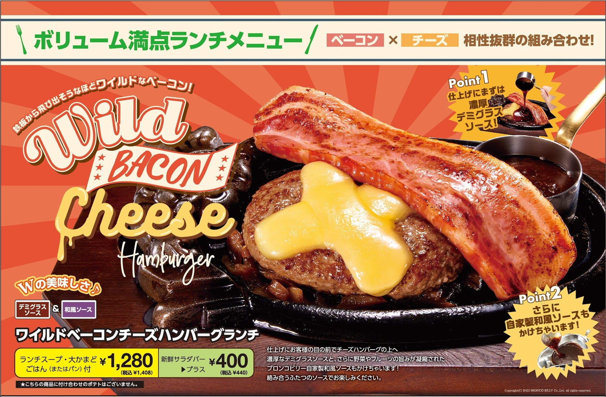 ステーキハウス ブロンコビリーを全136店舗展開する株式会社ブロンコビリー(本社:愛知県名古屋市 代表取締役社長:竹市 克弘)は、鉄板から飛び出そうなほどの大迫力なベーコンが印象的な『ワイルドベーコンチーズハンバーグランチ』を6月23日(金)より、ランチタイム限定(11:00~16:00)で提供開始します。URL: http://www.bronco.co.jp/