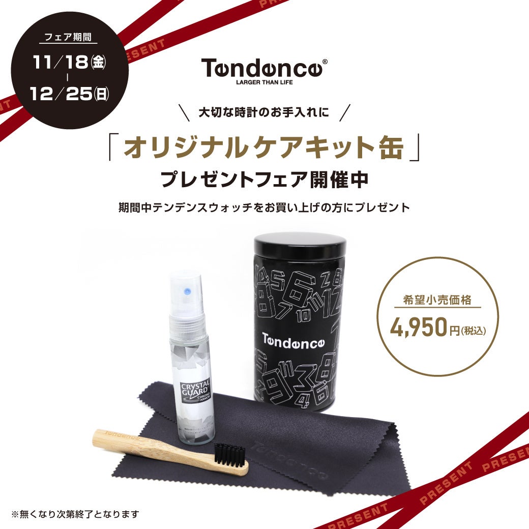 尚、11月18日(金)から開催されるクリスマスフェアでは、期間中、テンデンス公式オンラインストアや、テンデンス表参道店をはじめとする、対象となるテンデンス正規取扱店でテンデンスの腕時計を購入すると、同日販売する「テンデンスオリジナル時計ケアキット」をプレゼントいたします。
