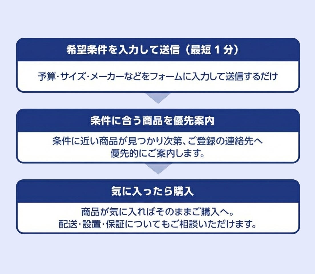 本サービスは、従来の「販売中の在庫から探す」スタイルとは一線を画すものです。飲食店企業が事前に欲しい機器の条件(メーカー、型番、予算等)を登録しておくことで、買取バイヤーに情報共有され、在庫化される前(Webや店頭に並ぶ前)に確保・購入できる仕組みになっております。