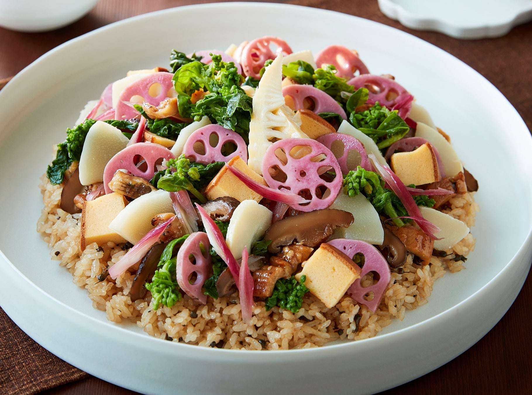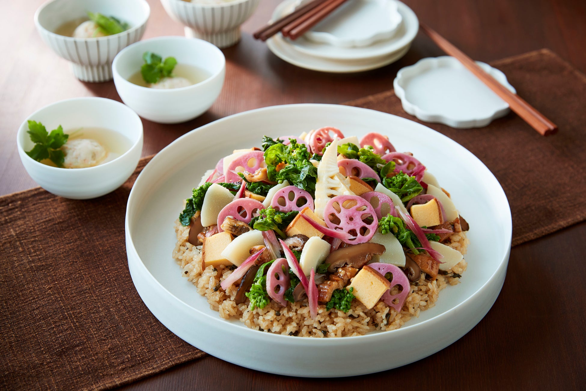 春を告げる京野菜「花菜(はなな)」はほろ苦く、しゃきっとした心地よい歯ごたえ。香り豊かな筍は、名産地である京都・西山丘陵産のものを。昆布と炊き上げるご飯※1には、まろやかな酸味と旨みの赤シャリ酢、紫蘇の実漬けを加えて美味しさを引き立てます。海老しんじょうのお吸い物もご一緒に。ひと手間かけて仕上げる時間もぜひお愉しみください。店舗受け取りでのご予約とともに、オンラインショップからの直接配送も承ります※2。数量限定ですので、ご予約はお早めに!