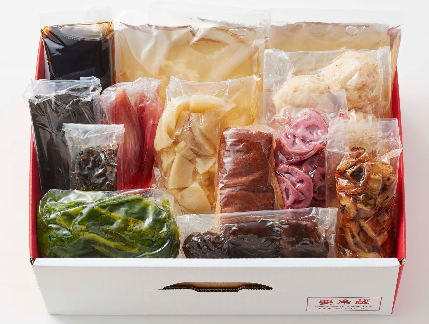 京野菜と穴子の春ちらしキット(赤シャリ酢/炊飯用昆布/紫蘇の実漬け/京都府西山丘陵産筍/京都産花菜/刻み穴子/椎茸煮/カステラ玉子/甘酢みょうが/酢蓮根)、海老しんじょうのお吸い物(海老しんじょう/吸い地)