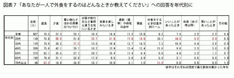 「60代」「70代以上」は全体的に低い割合になっていますが、「昼食」と「外食をするときは基本的に一人」については「70代以上」がトップでした。