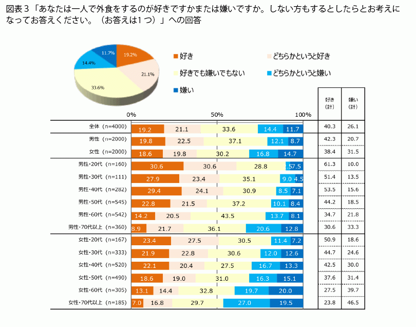 ● 一人で外食した場合、いろんなものを少しずつ頼んで食べられない。みんなでしゃべりながら食べたりメニューをシェアしたりできなくなったが、以前のようにみんなで鍋をつつくような習慣が戻ってほしい。(女性・30代) ● 仲間とワイワイ食べた方が楽しいに決まっている。(男性・50代) ● 外食イコール楽しい、というものだと思っているので一人だと楽しみがなくつまらない。(女性・30代) ● 「美味しいね」など、気持ちや楽しさを分かち合える。(女性・40代) 【それぞれのよさがある】 ● 家族や友人と外食するのはもちろん楽しいが、一人だと静かに考えごとをしながらゆっくり食べられるので好き。(女性・20代) ● 家族や夫婦で行って感想を言いながら食べたいので基本的に一人で外食はしない。でも年に数回たまの息抜きとして、夫が留守の夜に、一人でプラっと飲み屋さんに行き、焼き鳥と日本酒をゆっくりいただく。(女性・50代) 【もっと気楽に女性の一人メシ】 ● ラーメンが好きなので一人で選んで、一人で食べた方が楽。(女性・20代) ● 一人で外食をするのは全く苦ではないが、あまり量を食べられない体質なので店選びに苦労している。(女性・20代) ● グループで食べるのも楽しいが、大なり小なり相手に気を遣うので疲れる時がある。自分の好きな料理を自由に食べられる一人のほうがいいと思う。(女性・60代) ● 一人で気軽に食べたいので、小さな個室など、おひとり様用の席がもう少し増えるといい。(女性・20代) 【コロナの影響で】 ● 元々あまり外食はしないが、ランチや飲み会は友人に会うのが目的だったので、コロナで全くなくなり寂しい。(女性・50代) ● 大勢でお酒を飲みながらの外食が多かったが、それが全くできないのでとても残念。暫く我慢だ。(男性・70代以上) ● 一人で食べるのが好きなので、一人外食で物珍しくみられるのがなくなってよかった(女性・20代) |