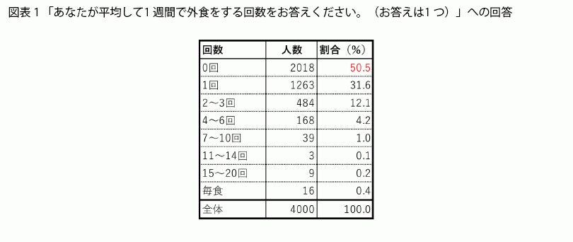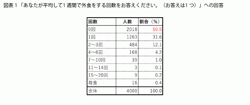 まず、「あなたが平均して1週間で外食をする回数をお答えください」(図表1)と聞いたところ、「0回」と回答した人が50.5%と最多でした。そして「1回」が31.6%、「2〜3回」が12.1%と続きます。1週間で外食をする回数が0回から3回の人を合計すると約94%となります。