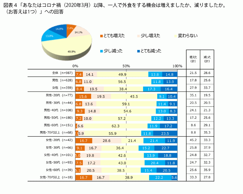一人で外食することがある人を対象に「あなたはコロナ禍(2020年3月)以降、一人で外食をする機会は増えましたか、減りましたか」(図表4)と聞いてみると、最も多かったのは「変わらない」(49.9%)でした。