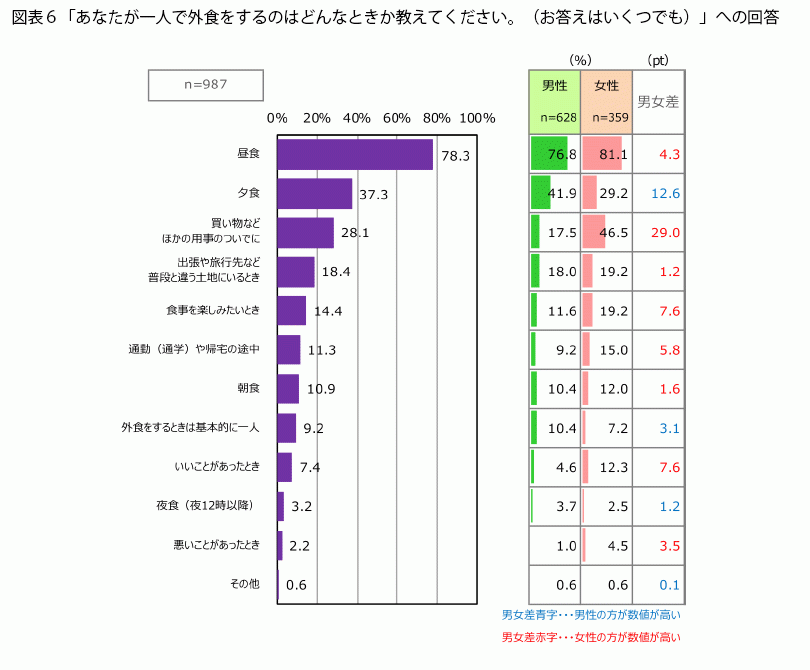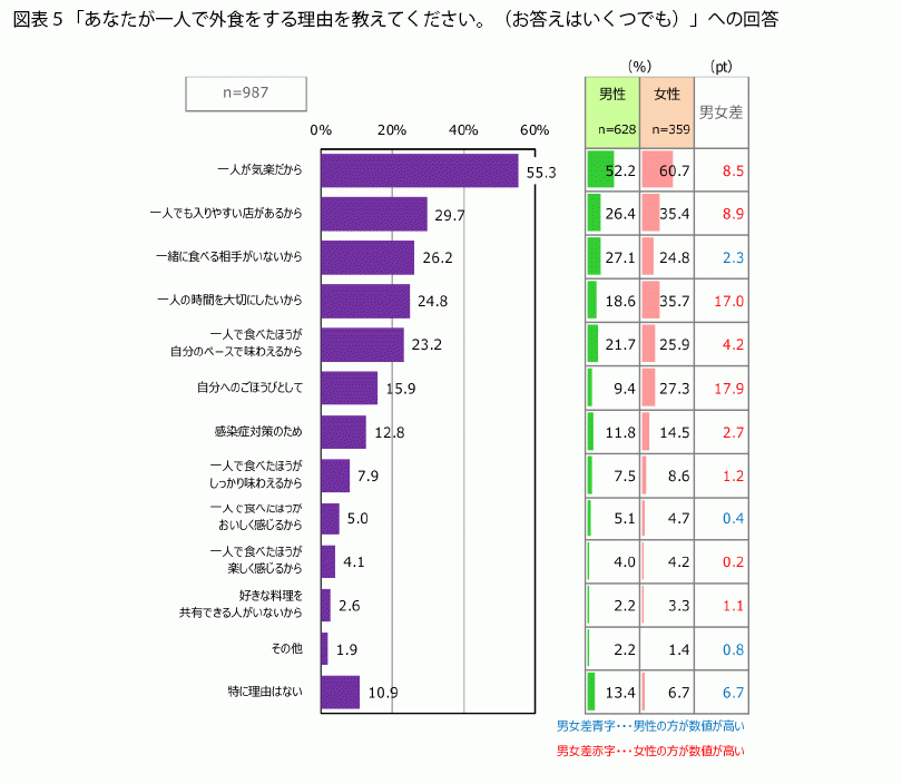 と、「自分へのごほうびとして」(男性:9.4%、女性:27.3%)は男女の差が非常に大きくなっています。女性の場合は、一人での外食で特別感を味わう人も多いようです。
