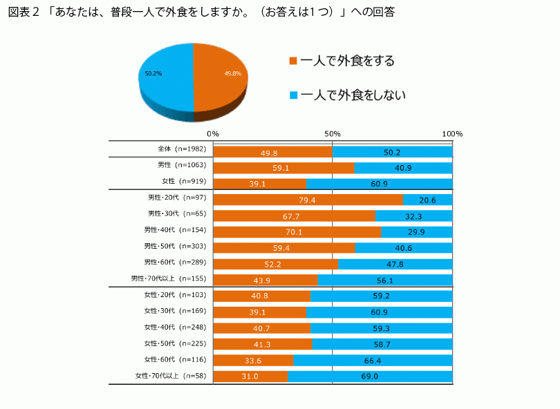 週に1回以上外食する人に、「あなたは、普段一人で外食をしますか。(お答えは1つ)」(図表2)と質問したところ、「一人で外食をする」が49.8%、「一人で外食をしない」が50.2%と、ほぼ半々という結果でした。ただ、性年代別に見てみると、割合は大きく異なります。「する」人の割合は全年代で男性が女性を上回ります。また、年代が上になるほど、「する」人の割合が減少する傾向があり、特に男性は顕著になっています。