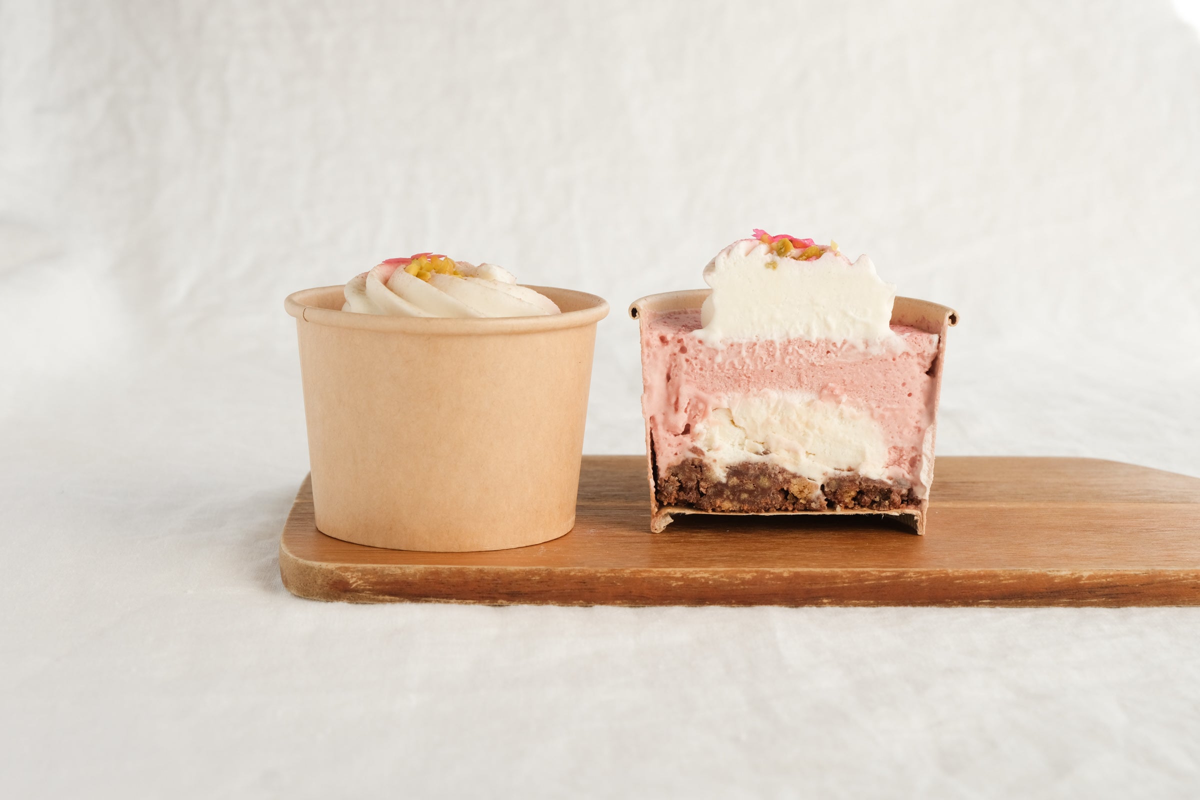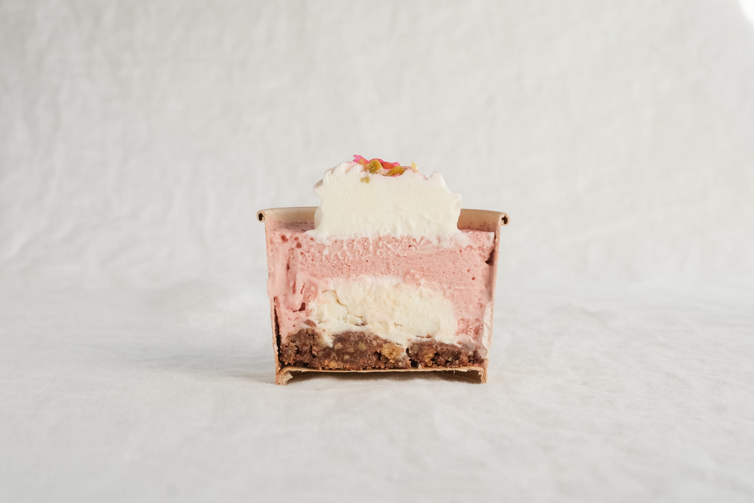 トップには、ほんのりピスタチオをトッピングし、お好みでムースに飾っていただけるエディブルフラワーを別添えでお届けします。