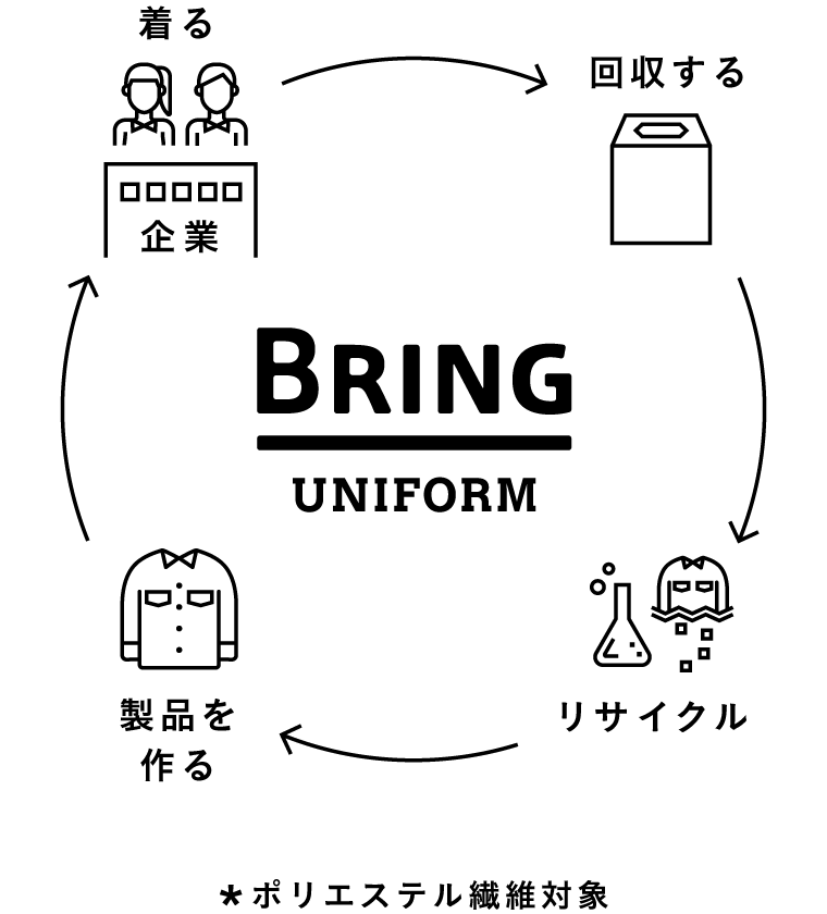 「BRING UNIFORM」は、企業の不要になった事業ユニフォームを回収し、服のポリエステル原料や自動車内装材などにリサイクルしています。なかでもポリエステル繊維100%のユニフォームはJEPLAN独自のPETケミカルリサイクル技術「BRING Technology™」を用いて、北九州響灘工場にて再生ポリエステル樹脂にリサイクルし新たな衣類等の原料に生まれ変わらせています。企業のワーキングユニフォームやオフィスユニフォームは、廃棄物処理法や関連法により産業廃棄物とされており、適正な処理が求められます。JEPLANは独自の技術と回収システムによって、不要なユニフォームをリサイクルし、市場に循環させる取り組みを行っています。