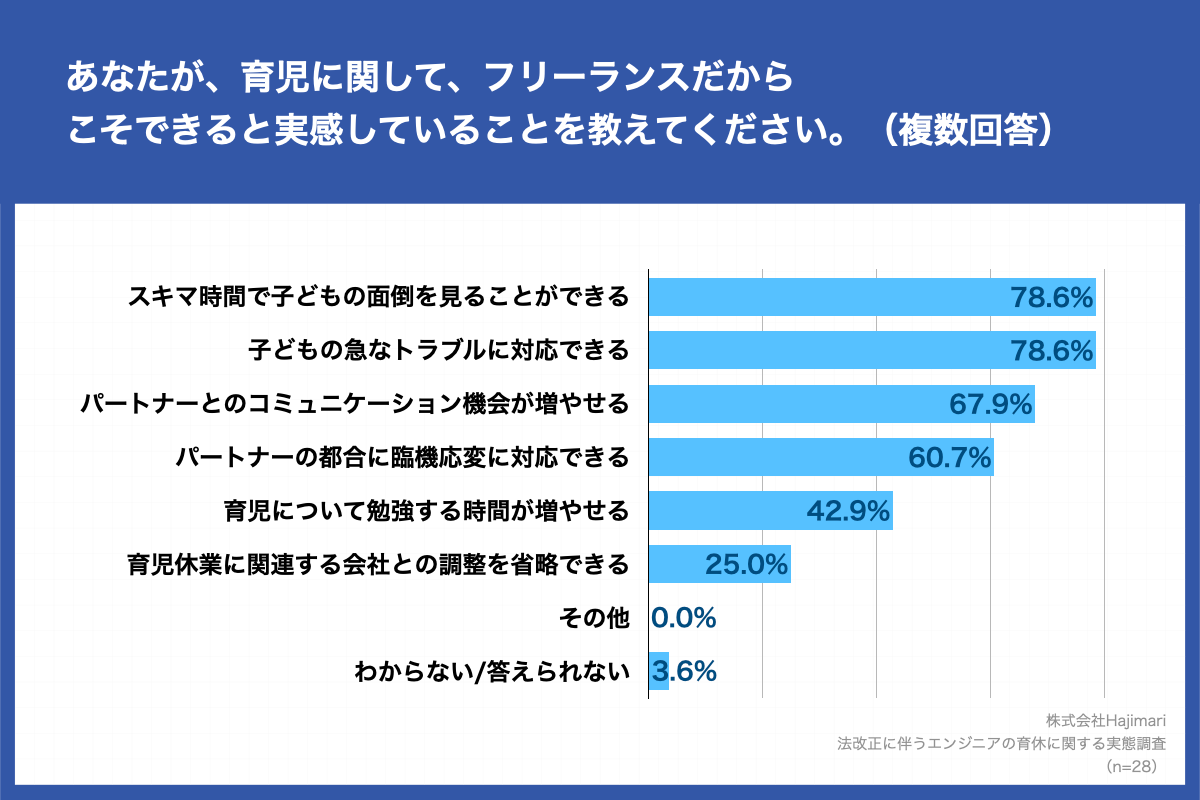 「あなたが、育児に関して、フリーランスだからこそできると実感していることを教えてください。(複数回答)」(n=28)と質問したところ、「スキマ時間で子どもの面倒を見ることができる」が78.6%、「子どもの急なトラブルに対応できる」が78.6%、「パートナーとのコミュニケーション機会が増やせる」が67.9%という回答となりました。
