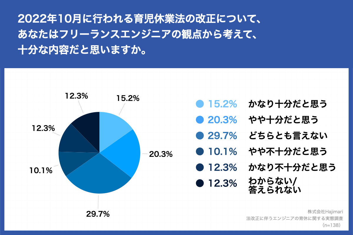 「出産予定日から8週までの期間に最長4週間取得でき、休業中の就業や2回の休業の分割取得も可能な「産後パパ育休」制度(申し出期限は原則として休業の2週間前まで)の追加や、2回の育休の分割取得、さらに特別な事情がある場合に1歳以降の育休再取得が可能になる、2022年10月に行われる育児休業法の改正について、あなたはフリーランスエンジニアの観点から考えて、十分な内容だと思いますか。」(n=138)と質問したところ、「かなり十分だと思う」が15.3%、「やや十分だと思う」が20.3%という回答となりました。