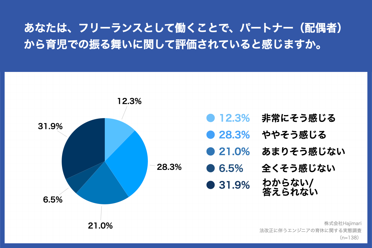「Q7.あなたは、フリーランスとして働くことで、パートナー(配偶者)から育児での振る舞いに関して評価されていると感じますか。」(n=138)と質問したところ、「非常にそう感じる」が12.3%、「ややそう感じる」が28.3%という回答となりました。