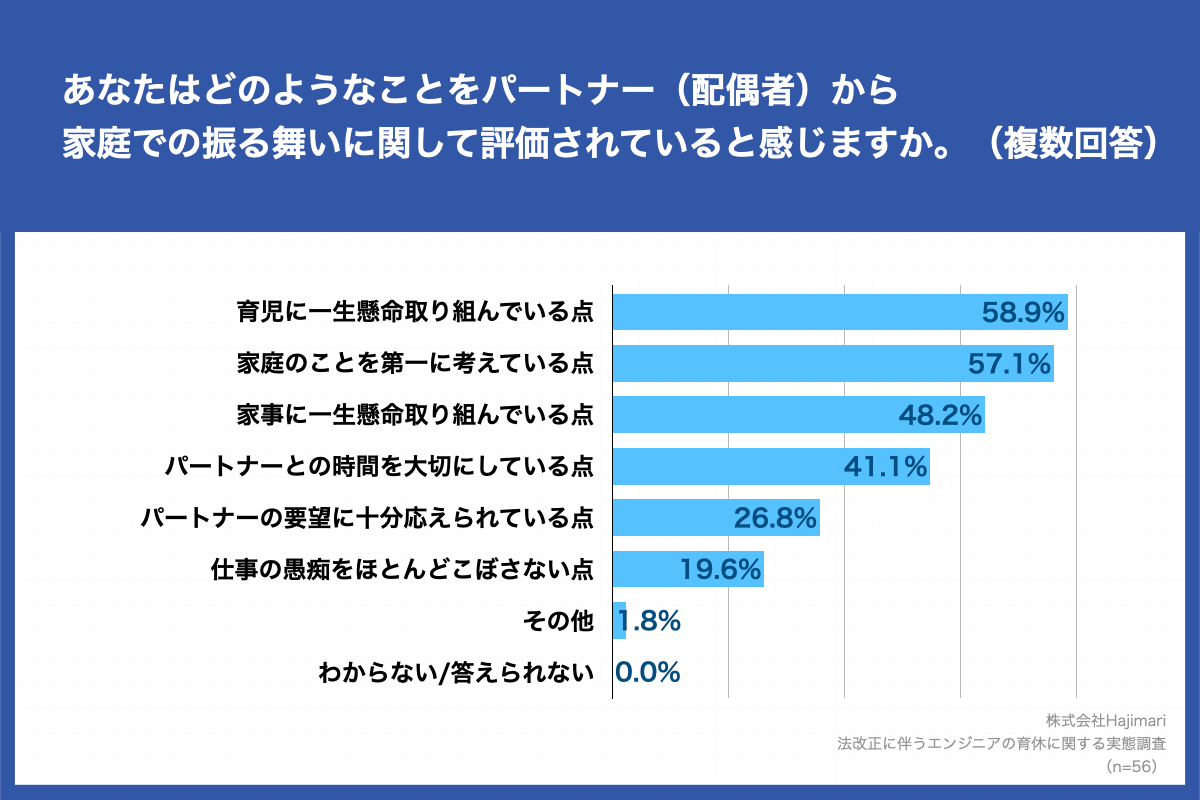 また、「あなたはどのようなことをパートナー(配偶者)から家庭での振る舞いに関して評価されていると感じますか。(複数回答)」(n=56)と質問したところ、「育児に一生懸命取り組んでいる点」が58.9%、「家庭のことを第一に考えている点」が57.1%、「家事に一生懸命取り組んでいる点」が48.2%という回答となりました。