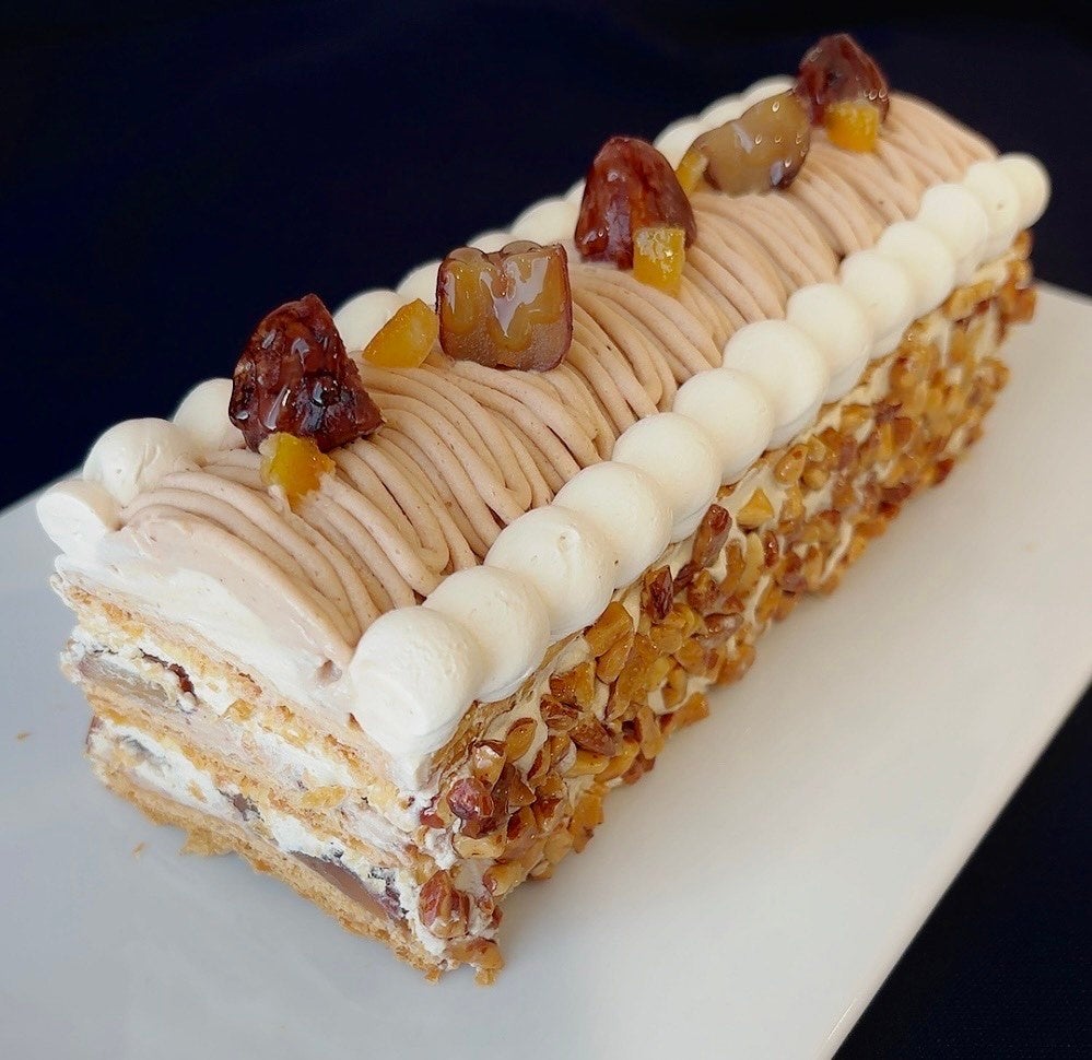 キャラメリゼしたサクサクの折りパイ。イタリア産のマロンペーストとソイホイップ、豆乳カスタードを織り交ぜたディプロマットクリームに栗の甘露煮とアクセントにオレンジピールをサンド。 上部の仕上げにたっぷりとあしらったモンブランクリームとサイドのナッツにも、香ばしくキャンディングしたこだわりのアーモンドを使用いたしました。