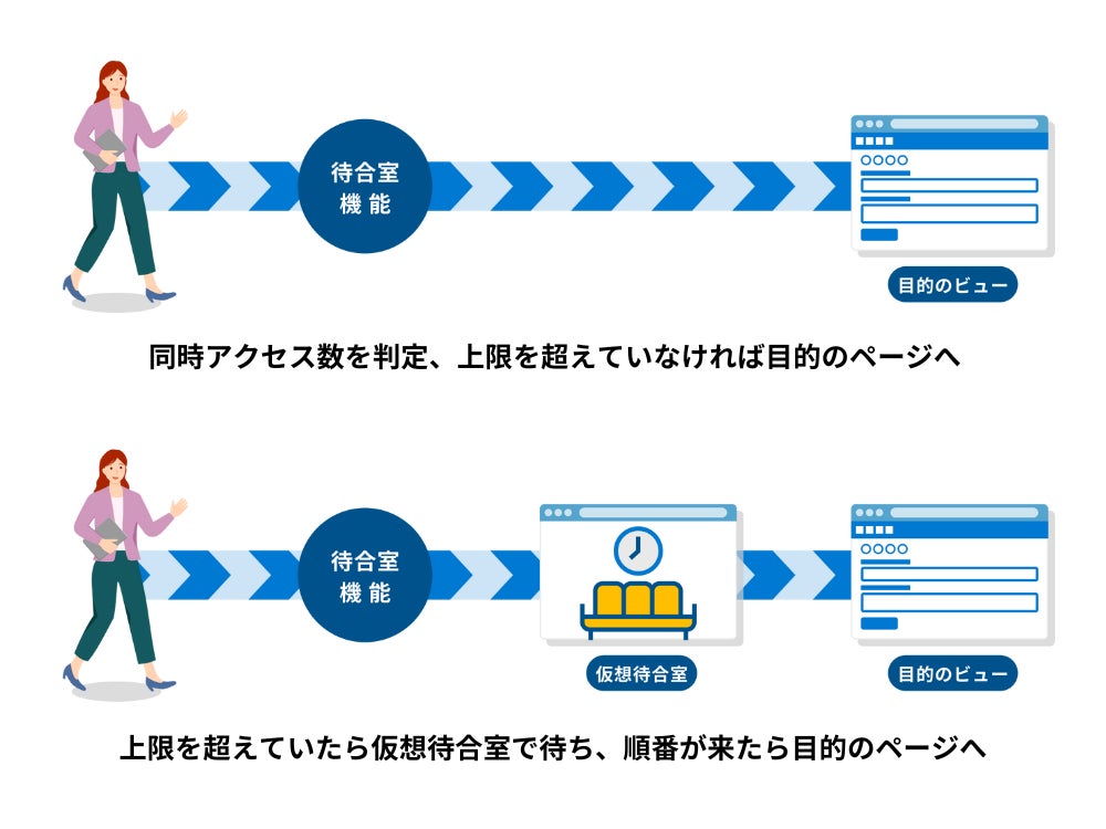 市民や顧客への情報公開ページ(ビュー)へのアクセス数を判定し、上限を超えた場合は自動で仮想待合室へ案内します。混雑状況と待ち時間の目安を表示し、順番が来たら自動的に目的のページに案内します。