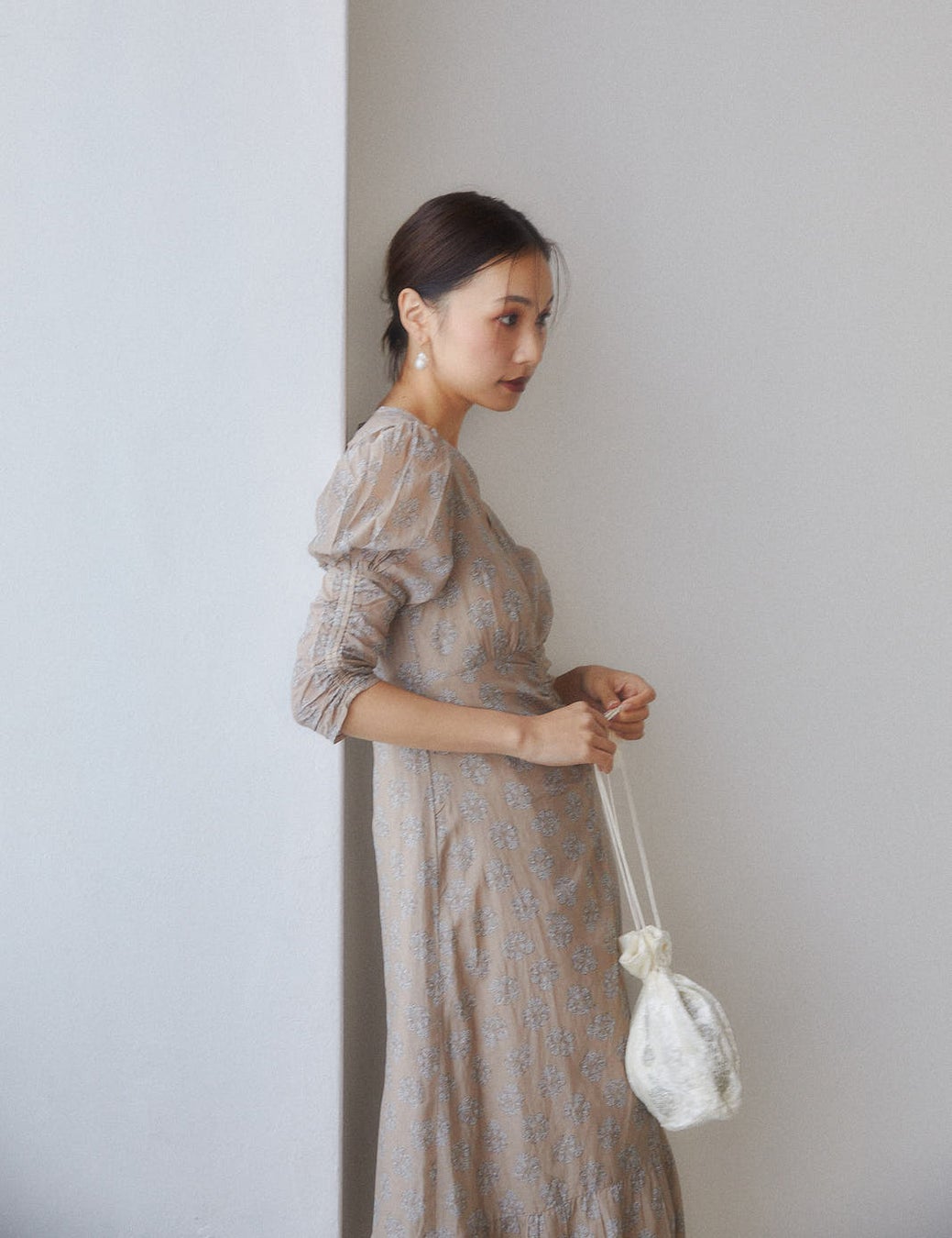裾部分は切り替えられて、ティアードになっており女性らしい華やかさも忘れずに。