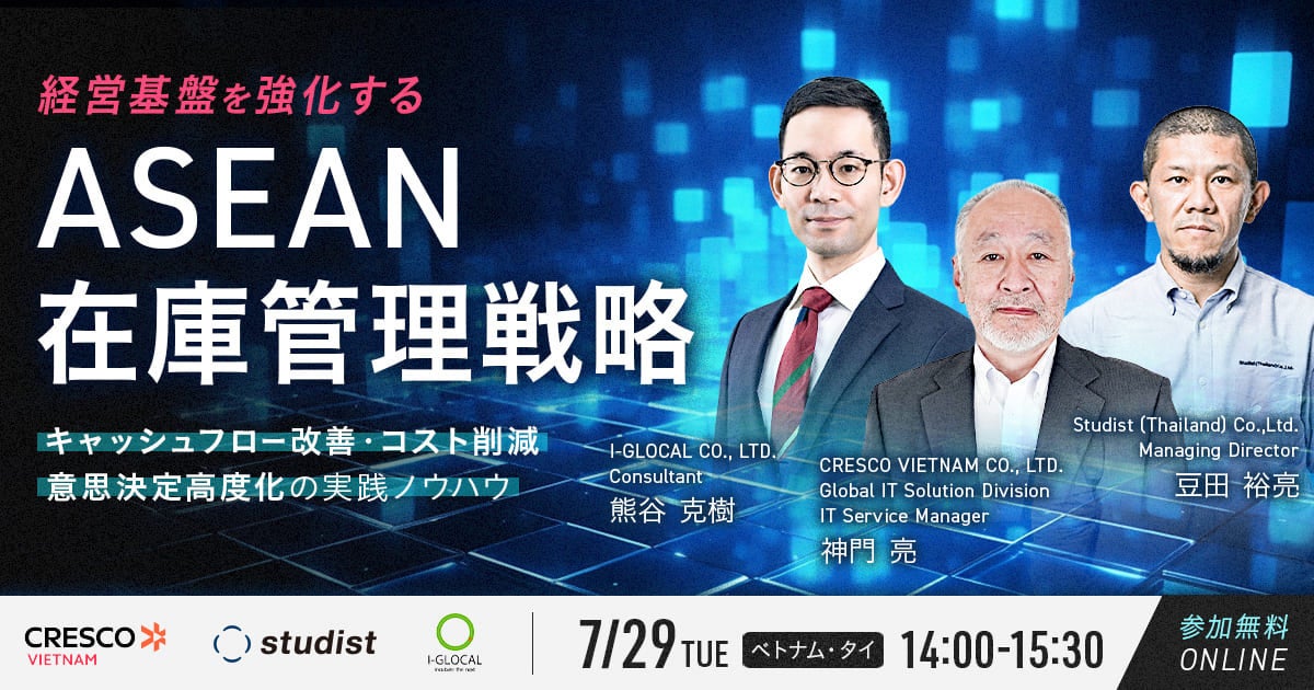 企業のオペレーション改革を支援する株式会社スタディスト(本社:東京都千代田区、代表取締役CEO:鈴木悟史、以下「スタディスト」)は、2025年7月29日(火)に、I-GLOCAL CO., LTD.およびCRESCO VIETNAM CO., LTD.と共催で、ASEAN市場における在庫管理戦略に関するオンラインセミナーを開催します。本セミナーでは、キャッシュフロー改善・コスト削減・意思決定高度化を実現する実践的なノウハウを、現地ビジネスに精通する3社の専門家が解説します。