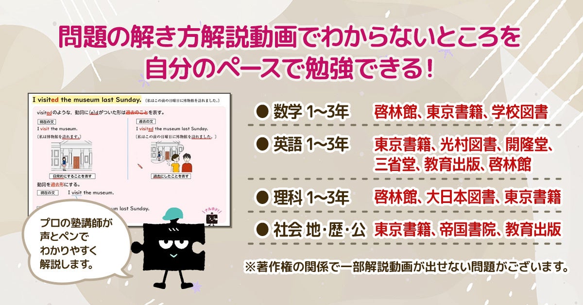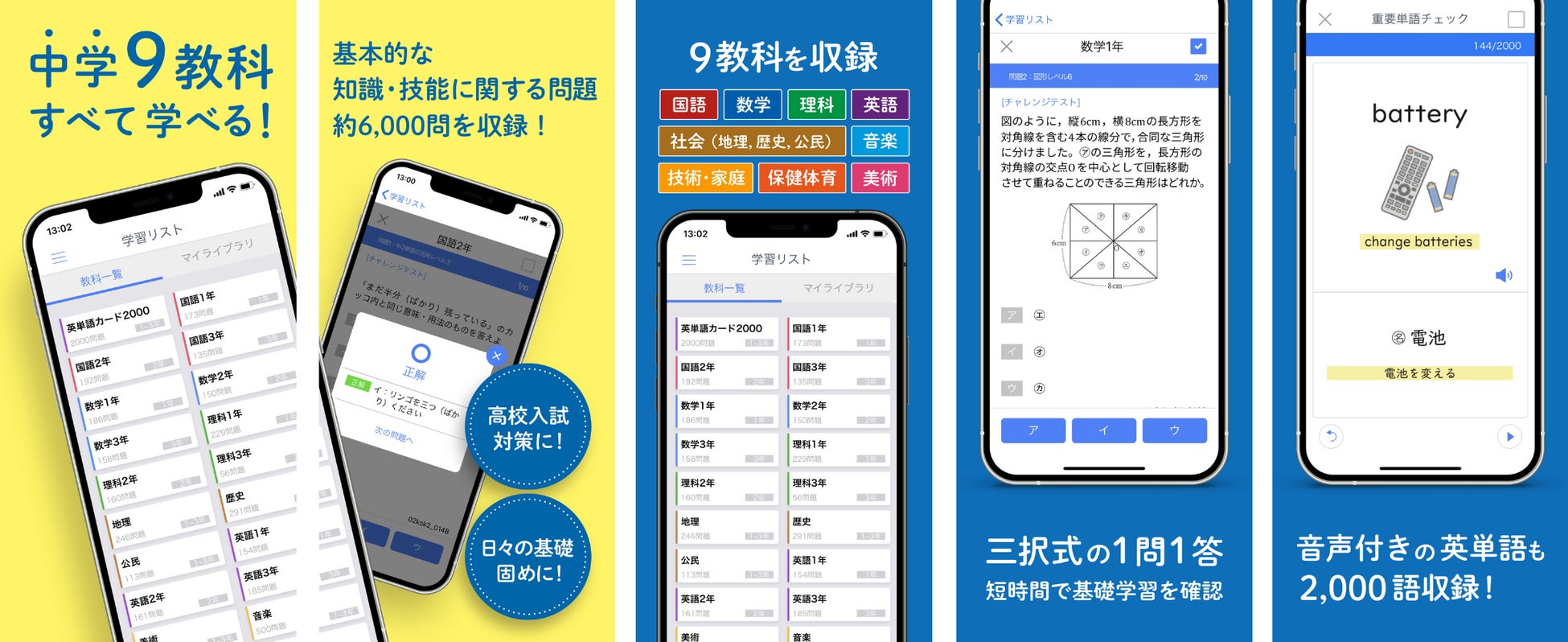 「ぴたサポアプリ」は全国レベルの学力テストをもとに、9教科6000題の問題を収録しています。