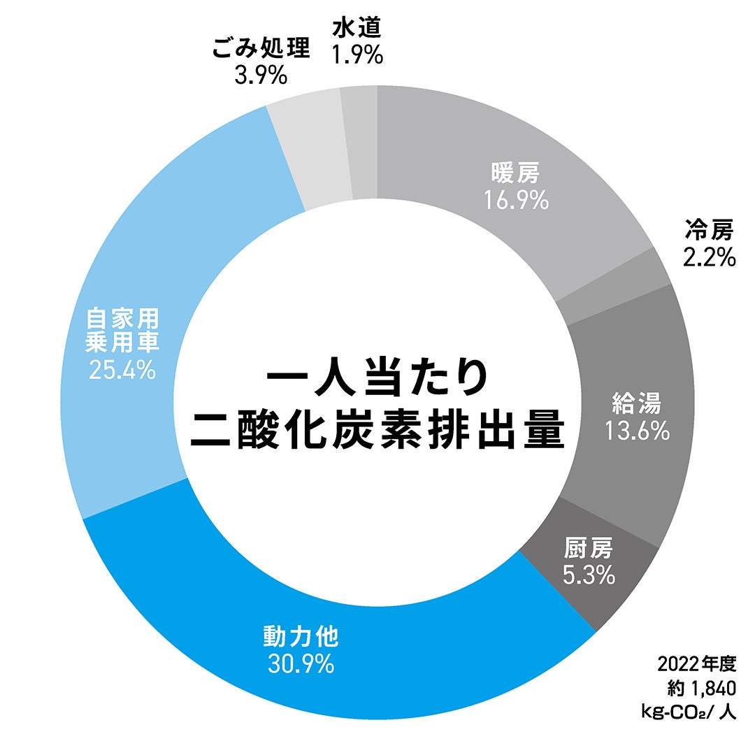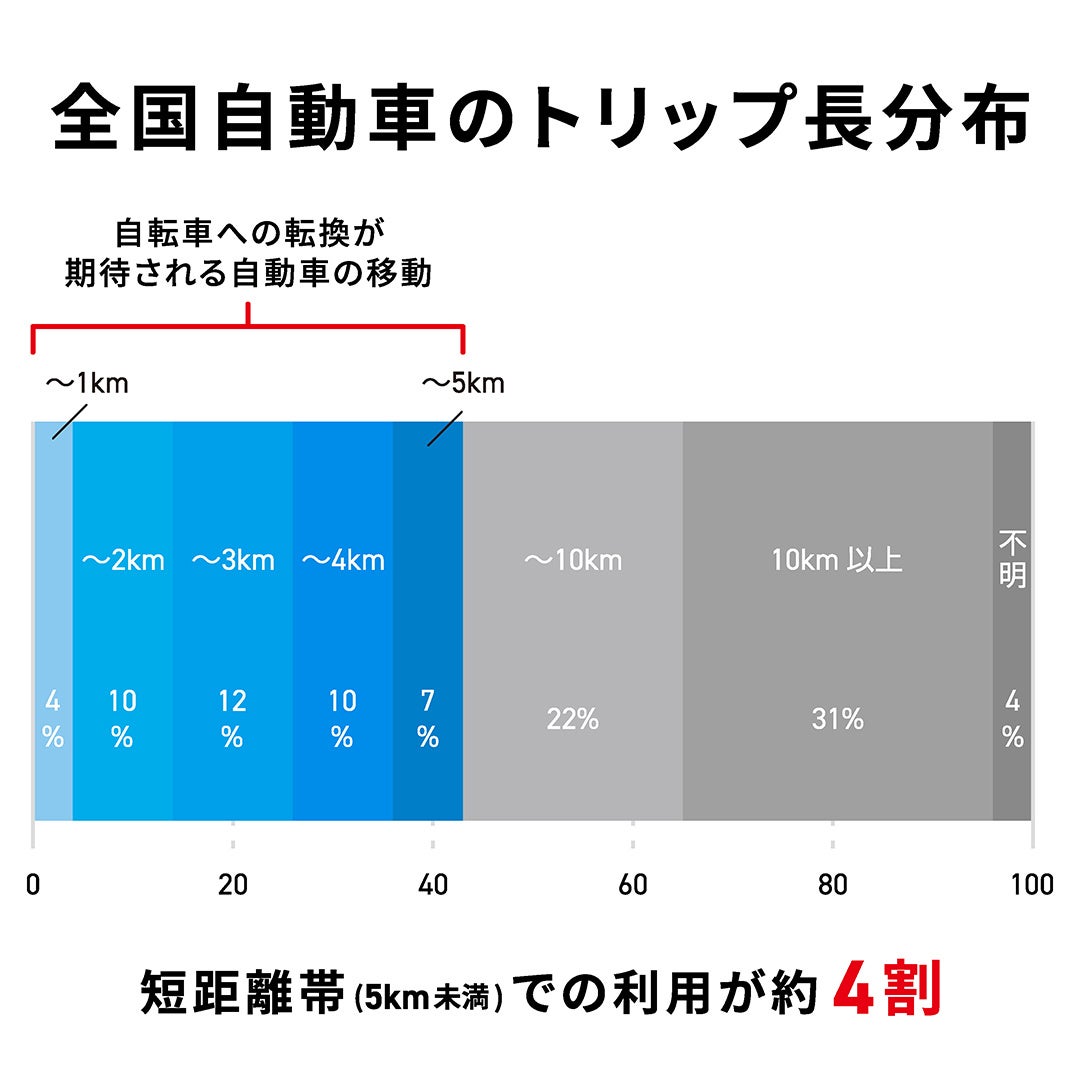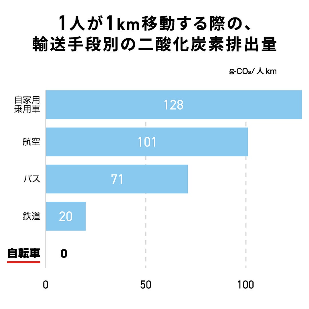 深刻化する地球温暖化にもっとも影響度の高い二酸化炭素は、家庭(国内)からの排出量の約25%が自動車からの排出であることがわかっています(1)。また、自動車利用の約40%が5km未満の利用であり、1人での移動が約80%であることもわかっています。この利用者帯は、自動車から自転車への転換可能性があると考えられます(2)。このような背景から、二酸化炭素の排出量を抑えられる自転車の積極的な活用を推進する「GOOD CYCLE JAPAN」という取り組みが行われています。
