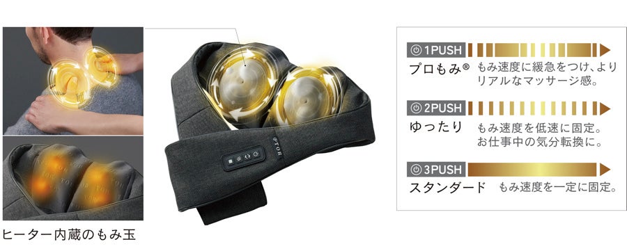 もみ速度に緩急をつけ、よりリアルなマッサージ感を目指した「プロもみ®」モードの他、もみ速度を一定のスピードでもむ「スタンダード」、より低速なスピードでもむ「ゆったり」の3モードを搭載。こりに合わせてじっくりもみます。