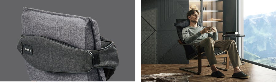 ベルトの固定に面ファスナーを採用することで、イスの背もたれ※に直接セットできるうようになりました。イスにもたれるだけで、マッサージができるようになり、ベルトを持ち続ける必要もなくなり、よりリラックスした姿 勢でマッサージができる新設計です。