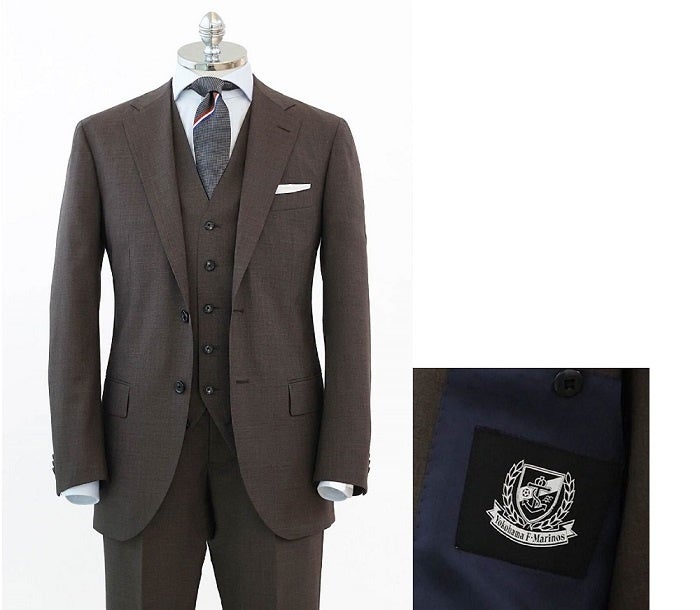 ナチュラルストレッチのウール100%の生地を採用。肩パットなしのアンコン仕立てでイージーな着心地を実現したオーダーメイドスーツです。ジャケットの内側には、「横浜F・マリノス」のエンブレムが刺繍されたオリジナル織ネーム、トリコロールカラーの衿吊を採用し、ディテールにもこだわりました。