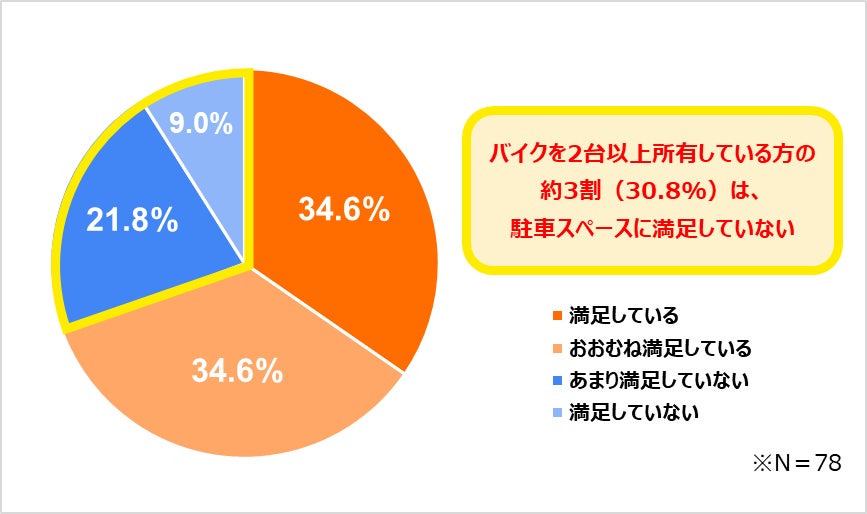 バイクを2台以上所有している方を対象に調査したところ、「あまり満足していない」(21.8%)、「満足していない」(9.0%)と回答した方が合計で約3割(30.8%)となりました。