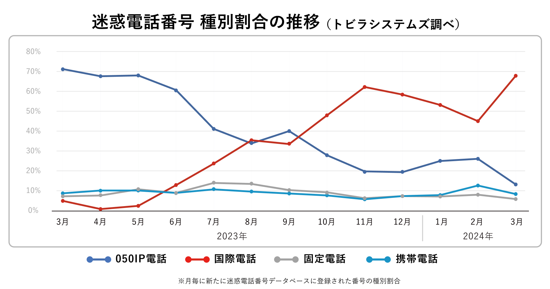 2024年3月に新たにトビラシステムズの迷惑電話番号データベースに登録された番号の種別割合は、昨年末から緩やかな減少傾向にあった国際電話番号の割合が再び増加し、67.6%に上りました。昨年のピーク時(2023年11月、62.2%)を超える急増となっています。