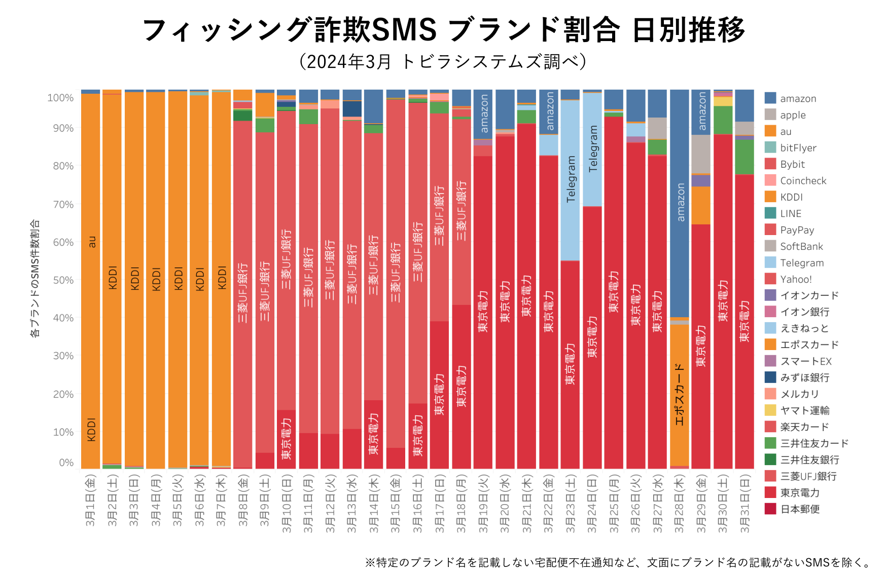 2024年3月は、詐欺SMSの文面に悪用される企業やブランドの名前が移り変わっていく動きが見られました。3月上旬は「KDDI」、中旬は「三菱UFJ銀行」、中旬から下旬にかけて「東京電力」をかたるSMSの発生が目立ちました。