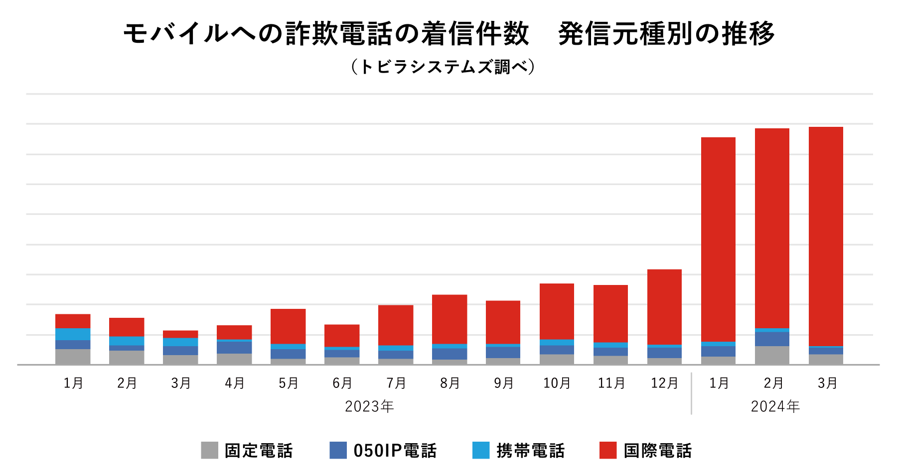 2024年に入り、モバイル(携帯電話)へ着信する詐欺電話が急増し、高止まりが続いています。特に、国際電話番号を利用した詐欺電話が大半を占めています。