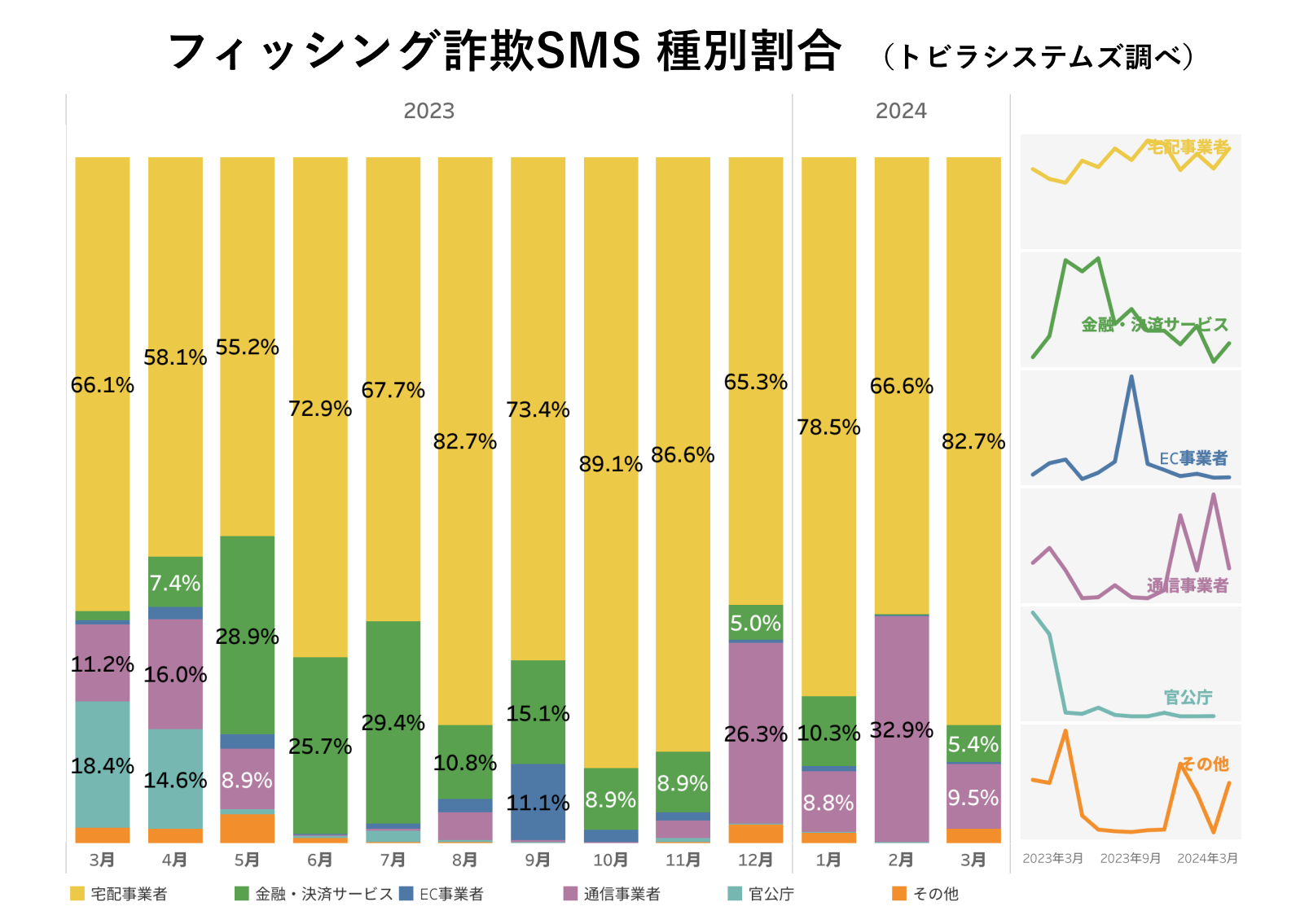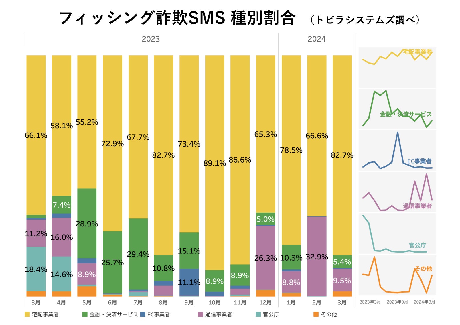 トビラシステムズの調査で、2024年3月に確認されたフィッシング詐欺のSMSの種別割合は、宅配事業者をかたる手口が前月から増加し82.7%を占めました。2月に急増した通信事業者をかたる手口は、3月は減少し9.5%となりました。