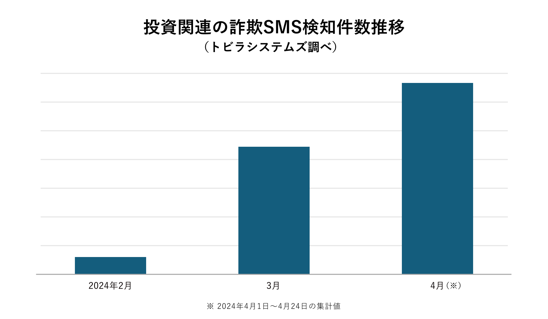 2024年4月における投資関連の詐欺SMSの検知件数は、4月24日時点で前月比1.5倍に増加しています。多い時には1日あたり数万件規模で発生しており、引き続き注意が必要です。