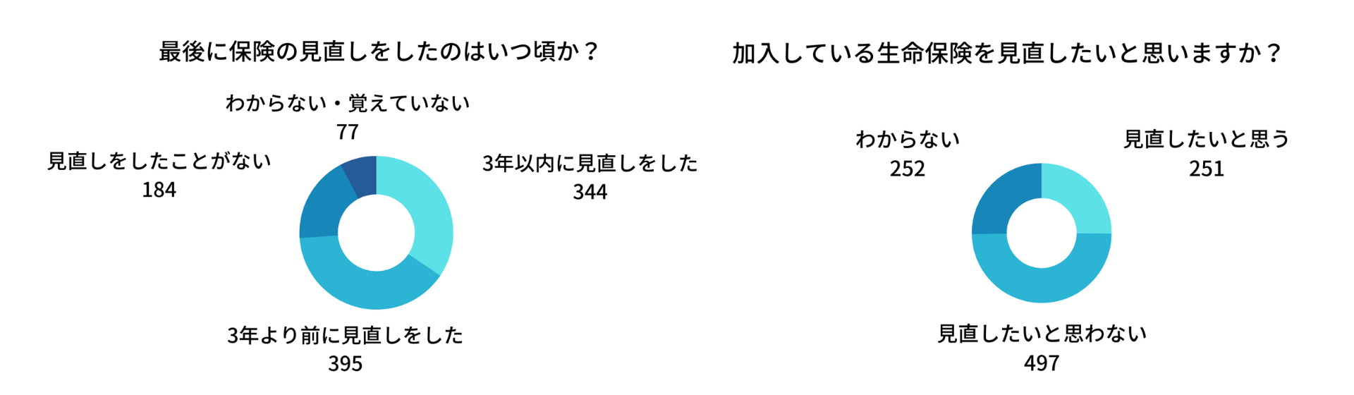 保険の見直しをした時期について、『あなたは、現在ご加入中の生命保険を最後に見直したのはいつ頃ですか?(複数加入している場合は、メインの保険についてお答えください)』という質問では、3年以内に見直しをした方344名(34.4%)、3年より前に見直しをした395名(39.5%)、見直しをしたことがない184名(18.4%)、わからない・覚えていない77名(7.7%)と回答しました。また、『現在加入している保険を見直したいと思いますか?(複数加入している場合は、メインの保険についてお答えください)』という質問については、見直したいと思う251名(25.1%)、見直したいと思わない497名(49.7%)、わからない252名(25.2%)という回答になりました。