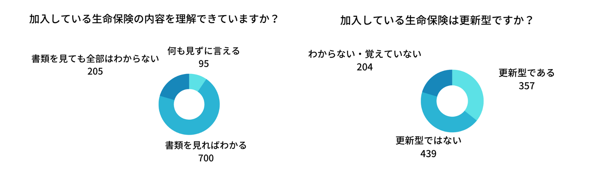 また、『加入しているメイン保険が更新型ですか(複数加入している場合はメインの保険についてお答えください)』と伺ったところ、更新型である357名(35.7%)、更新型ではない439名(43.9%)、わからない・覚えていない204名(20.4%)でした。