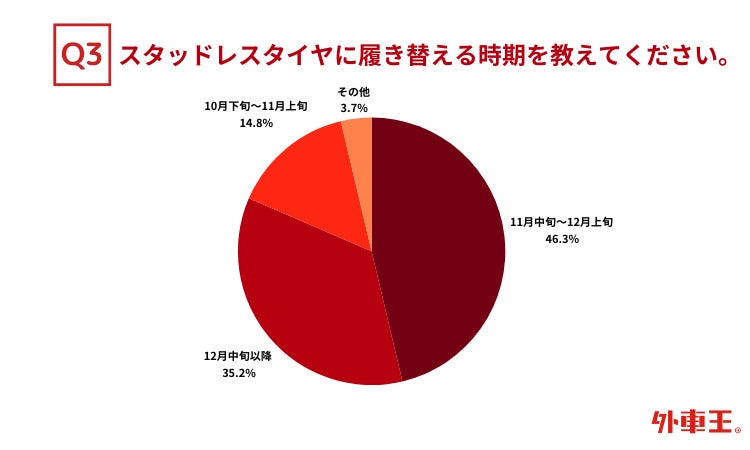 一方、スタッドレスタイヤに履き替える派の理由では「冬の路面凍結や積雪が心配だから」が最多で、安全性を重視した回答が目立ちました。また、履き替え時期は「11月中旬~12月上旬」が多く、冬のリスクを見越した早めの対応が顕著でした。