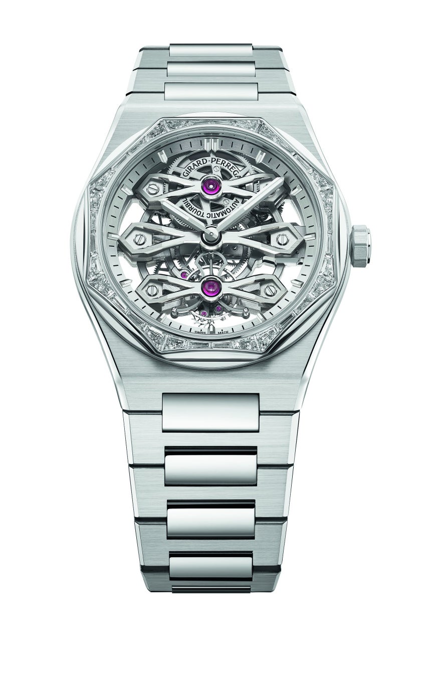 ロレアート スリー・ゴールド ブリッジの宝石のような美しい品質は一目瞭然です。しかし、ジラール・ペルゴはさらに、究極の輝きを求める時計愛好家のために、32 個(~3.2 カラット)のバゲットカットのダイヤモンドをセッティングしたモデルを用意しました。バゲットカットのダイヤモンドは、熟練のジェムセッターの優れた技術により特注のベゼルに正確にセッティングされています。ダイヤモンドは、サイズと形状が少しずつ異なる石が収まるよう設計された溝に嵌め込まれ、すべての石が同じ高さになるように熟練のジェムセッターが調整します。