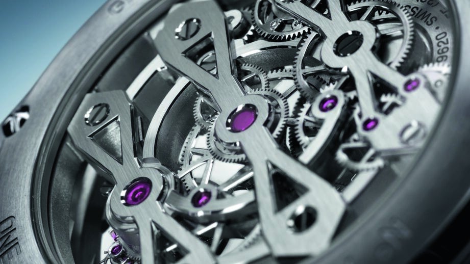 プラチナ製マイクロローターが香箱の後ろに組み込まれているため、透明なデザインを邪魔することもなく、自動で正確な巻上げを行い、腕元の自然な動きを音もなくエネルギーに変えて蓄えます。ムーブメントもこの構成のコンセプトに忠実に、形状と機能に関して一切妥協することなく約 55 時のパワーリザーブを実現しています。蓄光塗料をライン状に塗布した「バトン」型針は、スケルトン加工の純粋さを損なうことなく視認性を向上させるインナーケースのミニッツトラックに導かれるように、高度な技術を用いた静謐で明快な機構の上を滑らかに進みます。