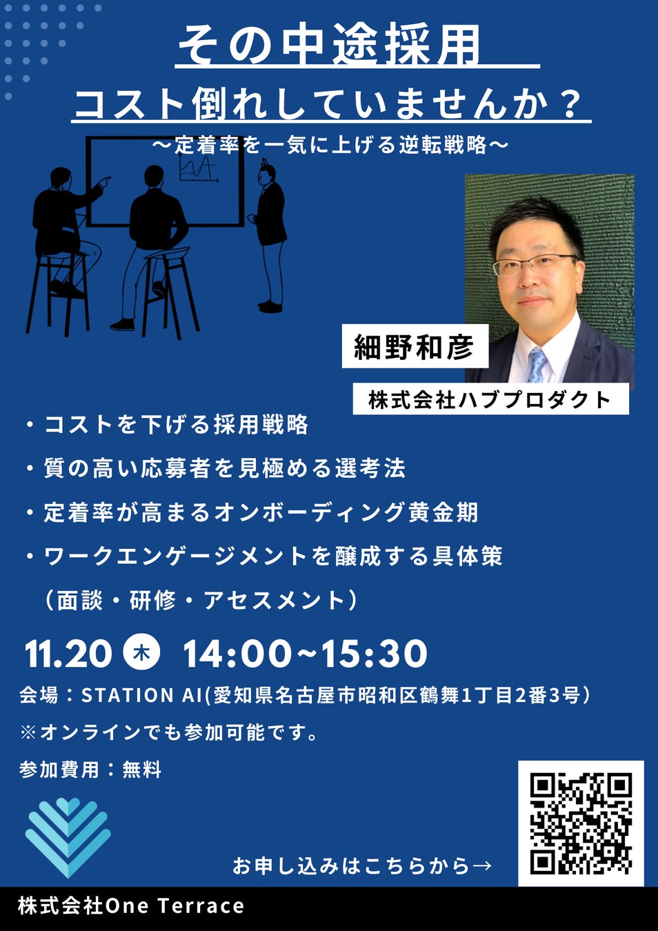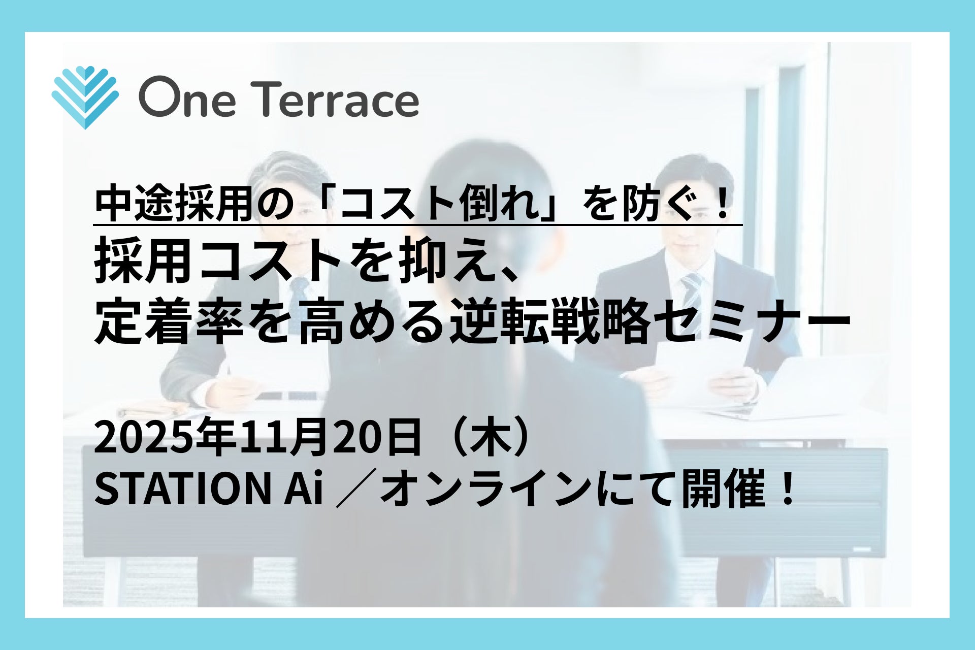 株式会社One Terrace(本社:東京都港区、代表取締役:石中達也、以下「ワンテラス」)は、2025年11月20日(木)に「採用コストを下げつつ定着率を高める逆転戦略」をテーマとした無料セミナーを開催いたします。