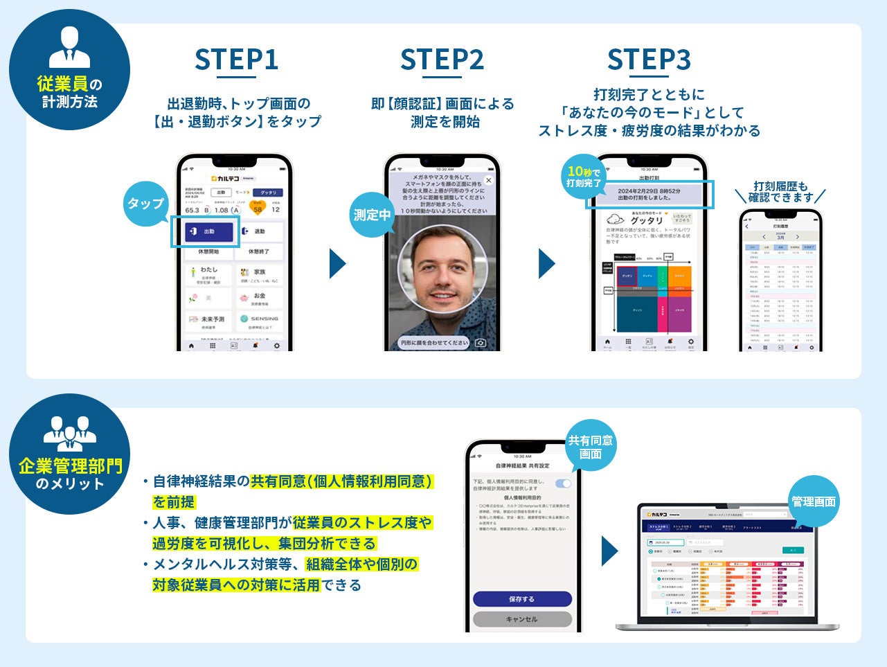 出退勤時にメンタルヘルスを計測することで、企業の健康経営の実現に貢献