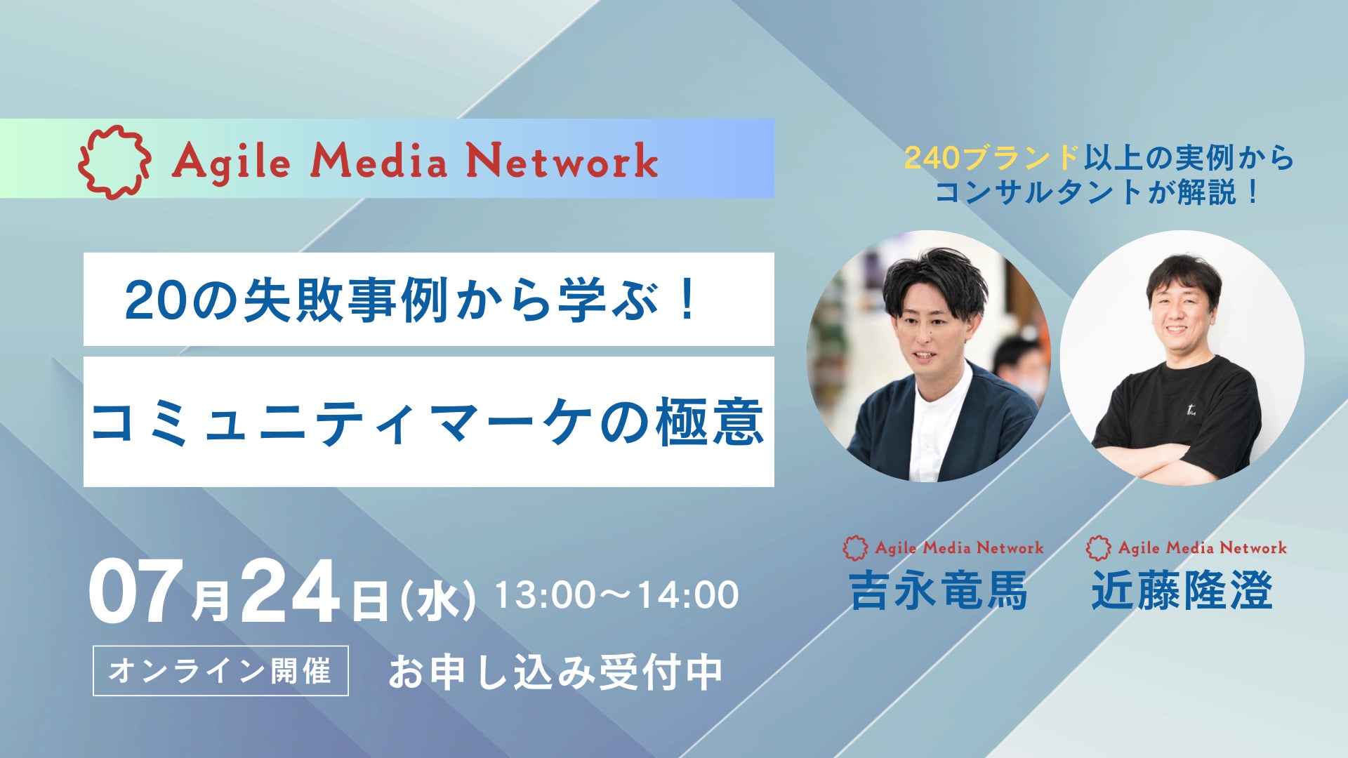『世界中の“好き”を加速する』をビジョンに掲げ、ブランドのファン育成・活性化を手がけるアジャイルメディア・ネットワーク株式会社(本社:東京都港区、代表取締役社長:寺本直樹、東証グロース上場:証券コード6573、以下AMN)は、このたびオンラインセミナー『20の失敗事例から学ぶ!コミュニティマーケの極意』を開催いたします。